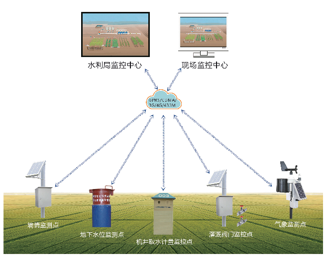 節(jié)水增糧信息化監(jiān)控系統(tǒng)基于機(jī)井取水計量監(jiān)控、地下水位監(jiān)測、土壤墑情監(jiān)測、田間氣象監(jiān)測、灌溉自動控制等系統(tǒng)進(jìn)行多功能設(shè)計,采用GPRS/CDMA或433MHZ的無線通信方式,實(shí)現(xiàn)監(jiān)控中心對多測點(diǎn)的遠(yuǎn)程監(jiān)控,為農(nóng)田水利管理和水資源監(jiān)管提供了可靠的技術(shù)保障。